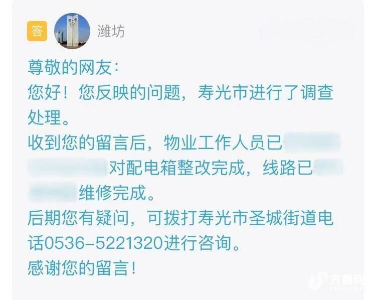 收到留言后,寿光市进行了调查处理。物业工作人员已对配电箱整改完成,线路也已维修完成。