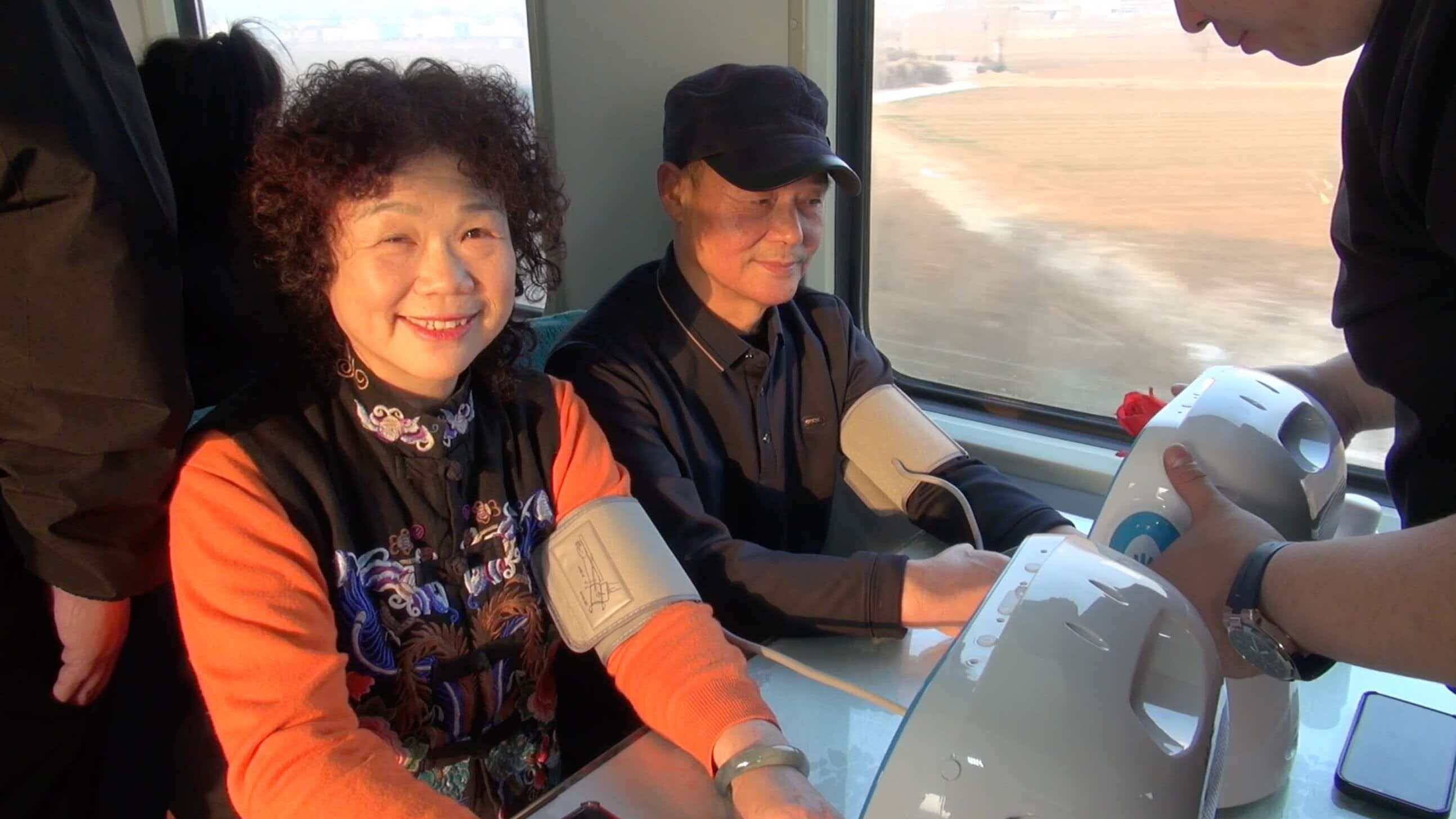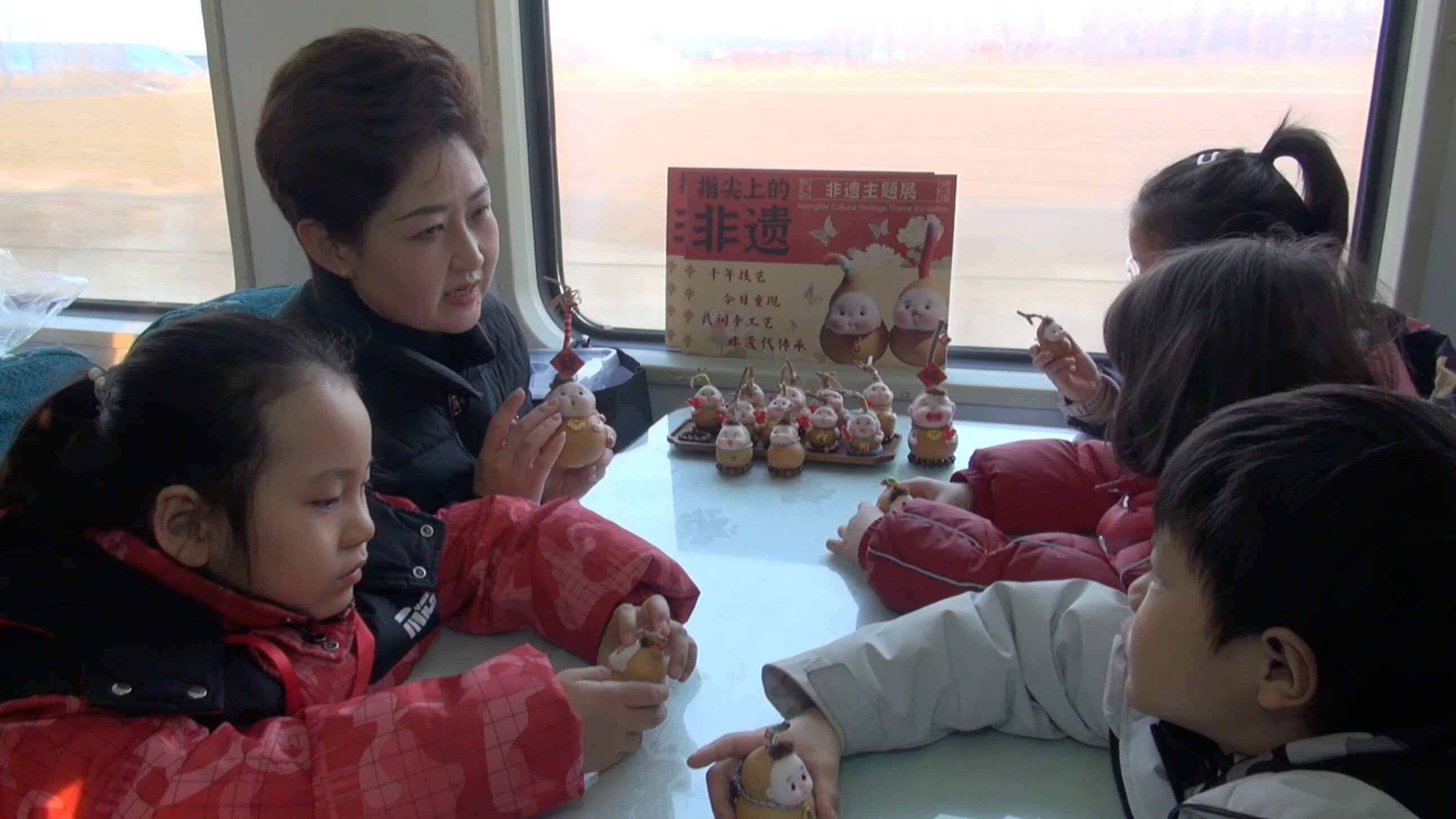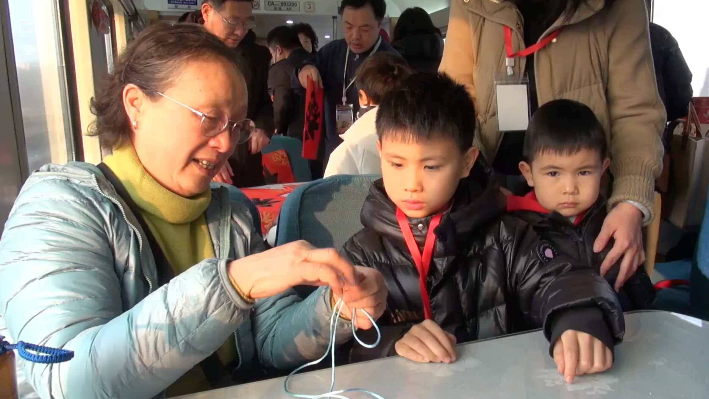 窗外田园风光旖旎,车上其乐融融:中国书法美术院一级书法师、山东省齐鲁义和轩书画院副院长李延平老师现场挥毫,为旅客送上饱含新春祝福的“福”字;齐鲁巧娘非物质文化遗产代表性传承人张丽琨带来的葫芦软陶娃娃,以憨态可掬的造型与精巧工艺吸引了大家纷纷驻足观赏;诸城派古琴第六代传承人、济南市历城区非遗代表性项目金石镌刻技艺传承人郭磊现场展示金石镌刻技艺,铁笔走石间尽显传统工艺的匠心神韵;济南市级结艺传承人胡立华则献上非遗结艺展演,一根彩绳在指尖翻飞缠绕,转眼化作寓意吉祥的中国结,引得旅客踊跃参与学习;专列同步引入袁洪峪泉韵酒店特色美食,酱香醇厚的酱牛肉、筋道弹牙的猪耳朵、搭配风味独特的风干鸡,让旅客在旅途中尽享地道风味,为年味之旅增添舌尖上的满足。列车上设立的“AI健康专区”更是人气爆棚,小勇AI健康陪护机器人化身“移动健康管家”,为旅客提供智能体检、健康咨询等服务,工作人员同步分享实用的健康管理与疾病预防知识,趣味互动与专业解答让现场氛围热烈不已,车厢俨然成为老友相聚的“温馨客厅”:老人们围坐在一起打牌、下棋、分享旅途趣事,窗外的田园风光缓缓掠过,时光在此刻变得温润悠长。