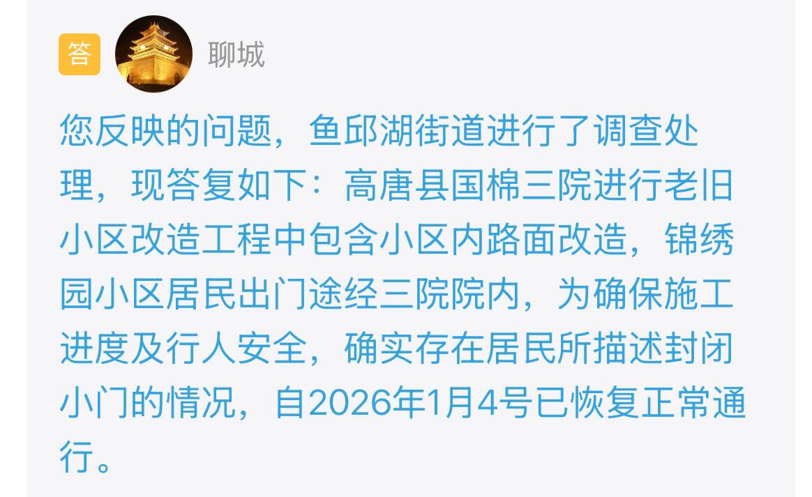 收到留言后,高唐县鱼邱湖街道进行了办理并回复:高唐县国棉三院进行老旧小区改造工程中包含小区内路面改造,锦绣园小区居民出门途经三院院内。为确保施工进度及行人安全,确实存在居民所描述封闭小门的情况。自2026年1月4号起,已恢复正常通行。